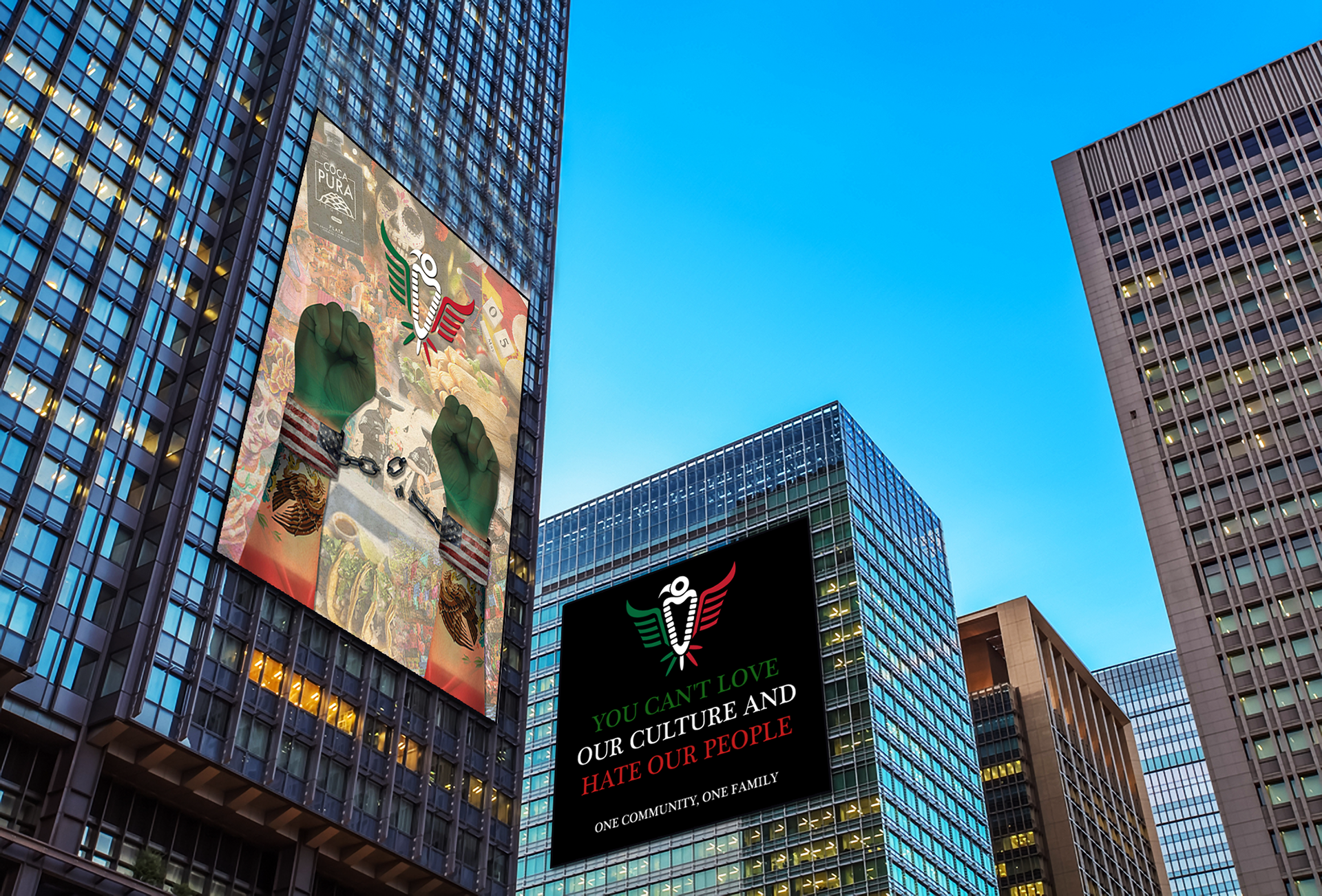 Viva Mexico is a conceptual non-profit organization based around community volunteerism. The non-profit aims to help Mexican Americans who face issues around gentrification and discrimination that would set them back in life. The strategy behind the logo is meant to take inspiration in Aztec glyphs while using black letter type which is popular in low rider culture. The colors are from the Mexican flag, The green stripe represents the Independence Movement. The white stripe represents the purity of the Catholic faith. The red stripe represents the Spaniards that joined in the quest for Independence and the blood of the national heroes. The billboard is meant to be a very loud group message while the four ad boards are meant to start a one-on-one conversation to help address the issue.